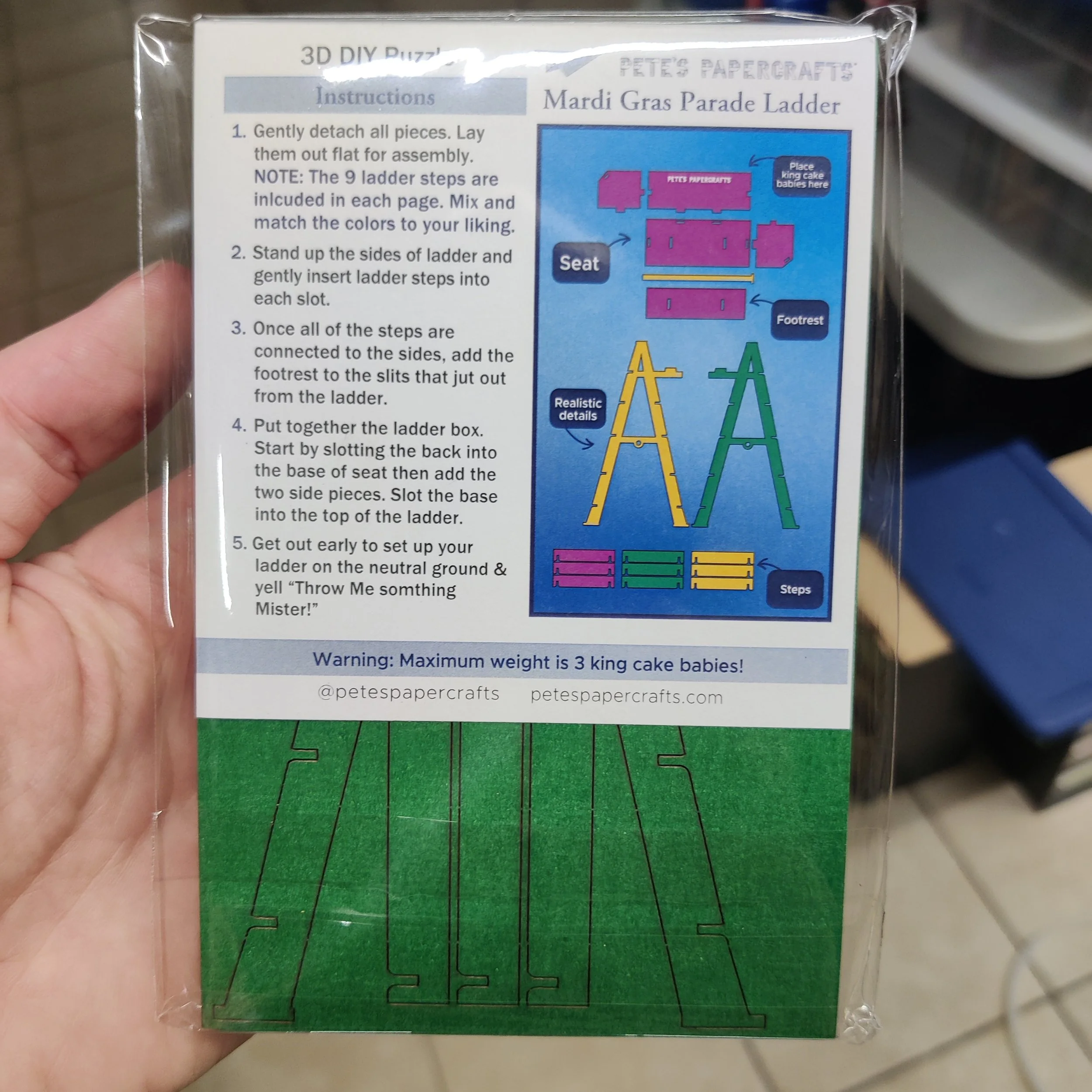 Papercrafts › Mardi Gras Parade Ladder Image 1 of 3 Image 2 of 3 Image 3 of 3 Mardi Gras Parade Ladder $18.00 Build your own Mardi Gras parade ladder. This 3D puzzle is a fun project Quantity: Add To Cart Added! Build your own Mardi Gras parade ladder. This 3D puzzle is a fun project Reviews Reviewer Name Review Date Star Rating Description Posted on Etsy Product Show More